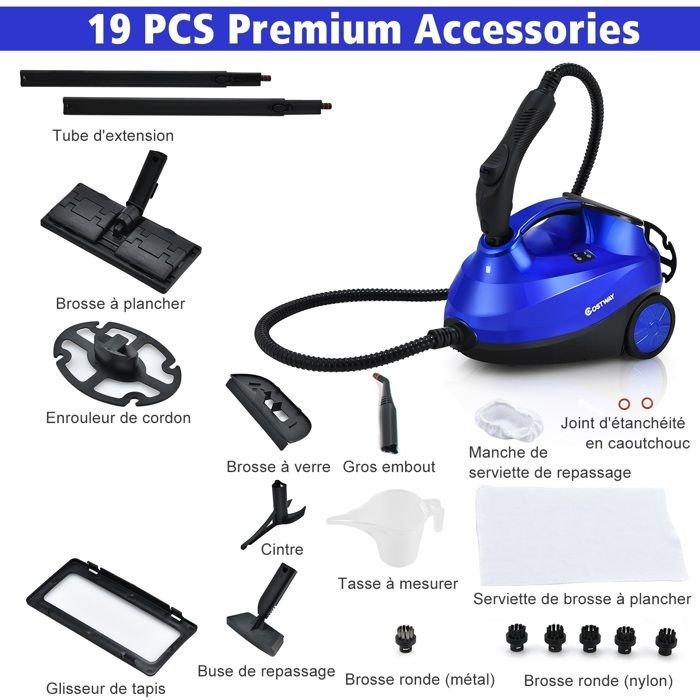 Limpiador a vapor multiusos COSTWAY de 2000 W para chinches – Tanque de 1,5 L, 19 accesorios, 4 barras, indicador LED, 108 ℃, control de ácaros, color azul