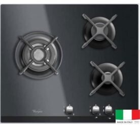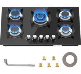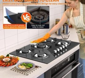 Placa de gas de 4 quemadores, 8060 W, empotrada, vidrio negro, gas natural/propano