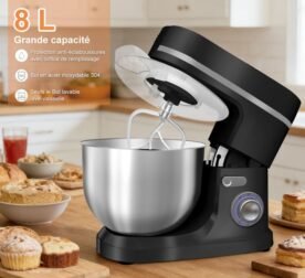 Batidora de pie Homlee de 1800 W – Tazón de 7,2 L – 6 velocidades – Acero inoxidable – Color negro – Clase energética A+++