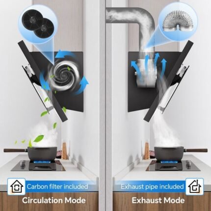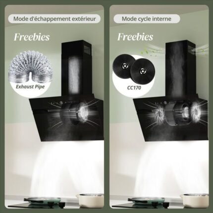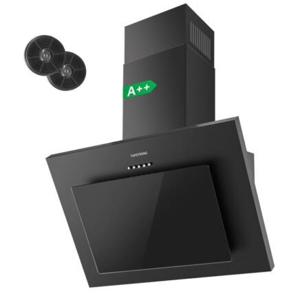 Campana extractora de 60 cm, canalizada o recirculante con filtro de carbón, 3 velocidades, vidrio templado, color negro, campana de cocina angular, A++