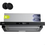 Campana extractora angular Comfee de 60 cm – 800 m³/h – Clase energética A++ – Controles gestuales – 4 velocidades – 2 filtros de carbón – Cristal negro