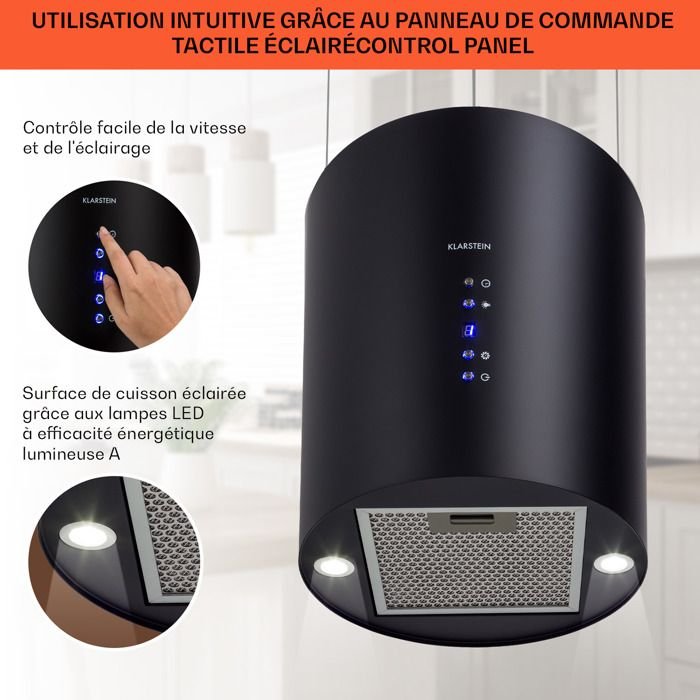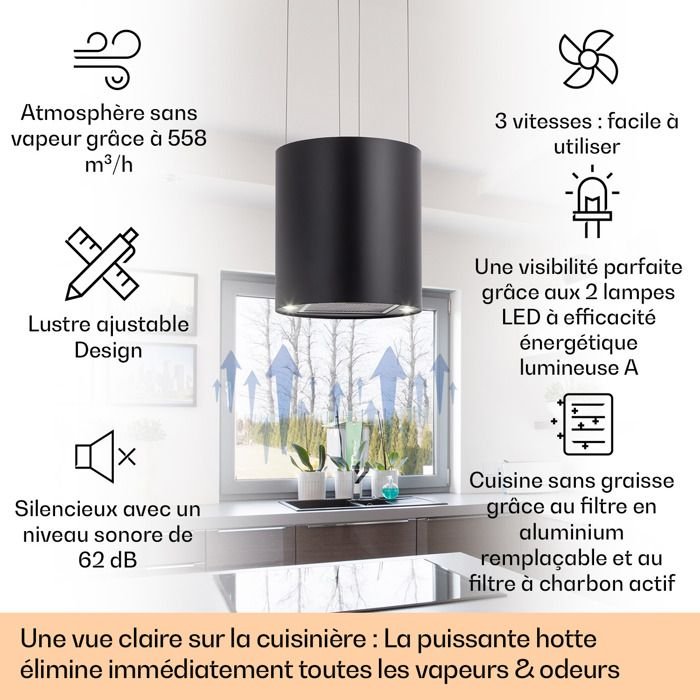 Campana extractora de isla Klarstein de 35 cm con ventilación exterior – 558 m³/h, 3 velocidades – campana extractora de isla central – color negro