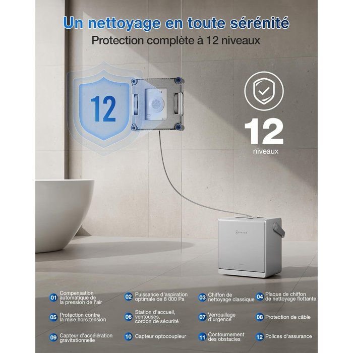 | Otras características | Sistema de protección de 12 niveles. Placa de limpieza flotante. 8 funciones de protección de hardware. Equipado con un sensor de aceleración de gravedad. Sensores optoacopladores para detección de bordes con un tiempo de respuesta ultrarrápido de 0,2 segundos. Grosor mínimo del vidrio: 3 mm. Tamaño mínimo de ventana aplicable: 30 x 40 cm. Ángulo máximo para vidrios en ángulo: 45°–135°. |