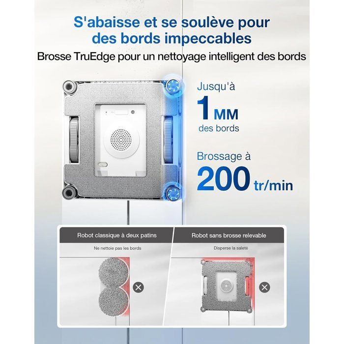 | Características especiales | Estación multifuncional. Nivel de ruido reducido. Se adapta a diferentes tipos de ventanas. Sistema de protección inteligente. Cable compuesto (potencia + seguridad). Cepillo TruEdge. Pulverización automática de tres chorros. Planificación de trayectoria WIN-SLAM 4.0. Mayor eficiencia de limpieza. Control remoto mediante app. |