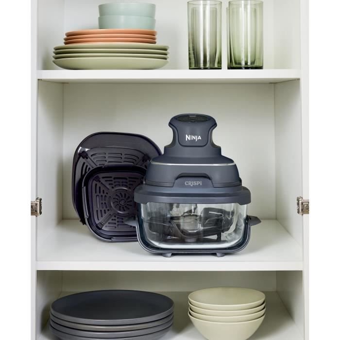 Descripción del Producto El sistema de cocina portátil Ninja Crispi ofrece la potencia de una freidora de aire de 1700 W en un diseño compacto y modular, fácil de guardar y transportar. Utiliza recipientes intercambiables de vidrio de borosilicato de 1,4 L y 3,8 L con alta resistencia al calor. Estos recipientes permiten cocinar, dorar, mantener calientes o recalentar alimentos, ya sea directamente del refrigerador o congelados, sin riesgo de choque térmico. Desde comidas para compartir hasta aperitivos para una pequeña reunión, use cualquiera de los recipientes según sus necesidades. Su tamaño compacto y diseño apilable lo hacen ideal incluso para cocinas pequeñas.