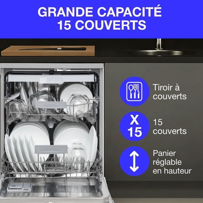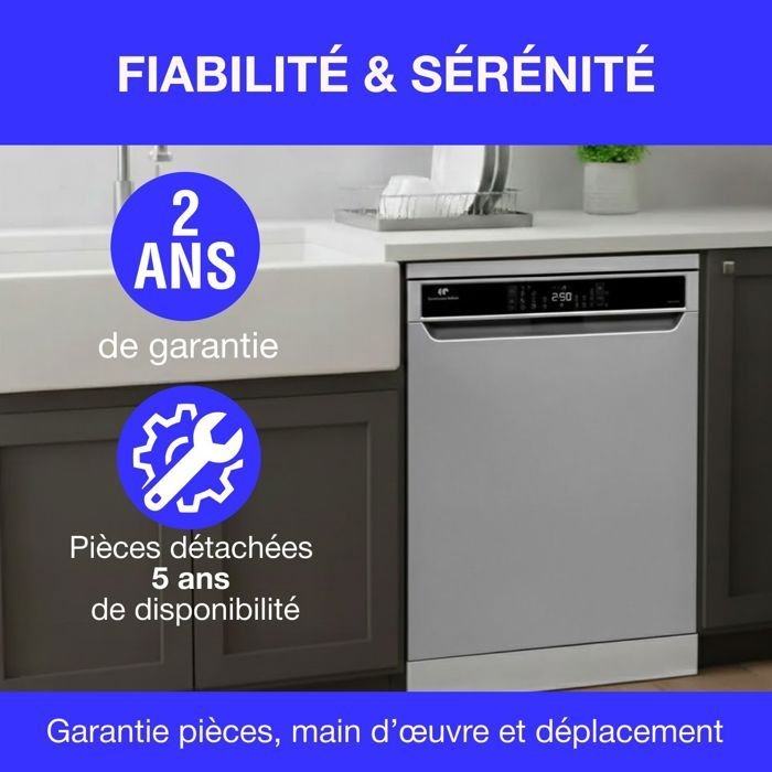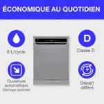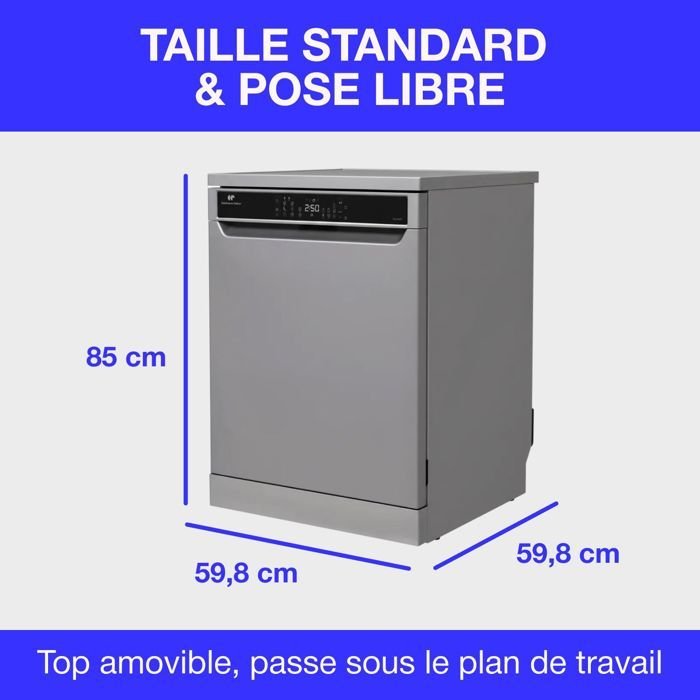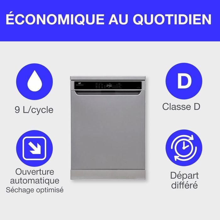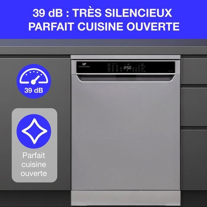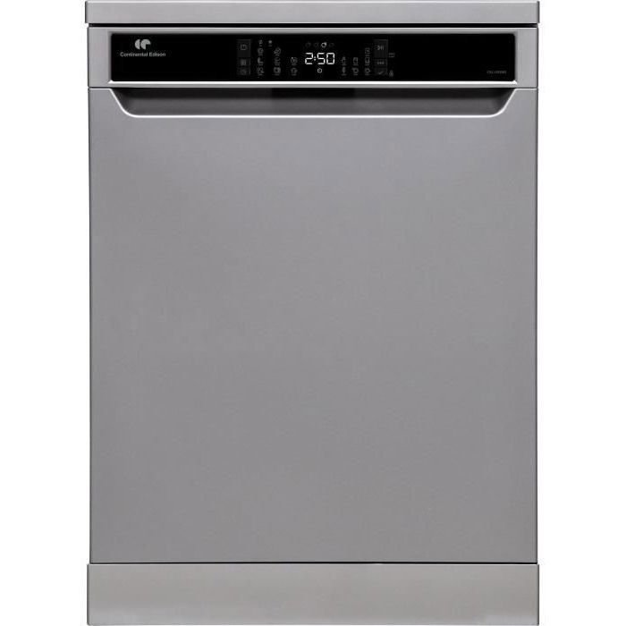 | Nombre del producto | Lavavajillas de libre instalación Continental Edison – 15 cubiertos – 59,8 cm de ancho – Clase energética D – Motor de inducción – 39 dB – Plata |