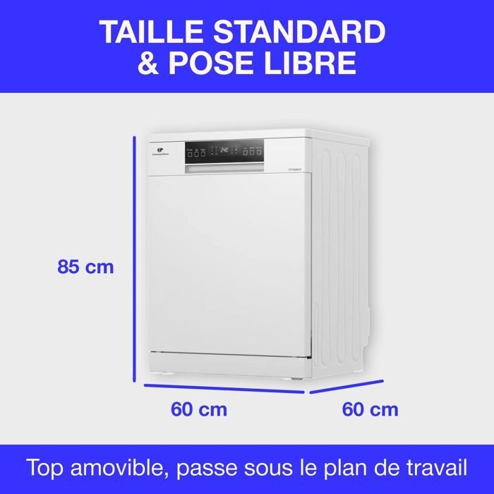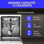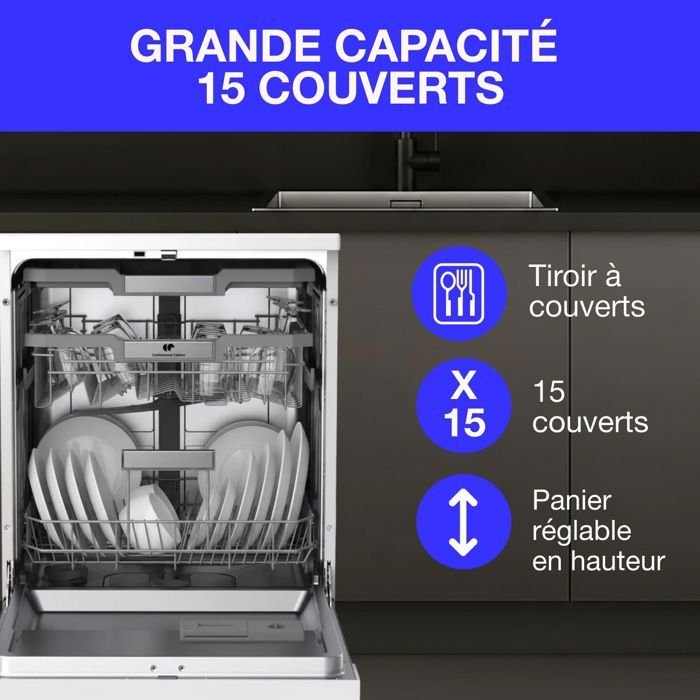 Lavavajillas de libre instalación Continental Edison – 15 cubiertos – 59,8 cm de ancho – Clase energética D – Motor de inducción – 39 dB – Plata