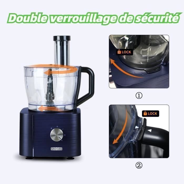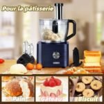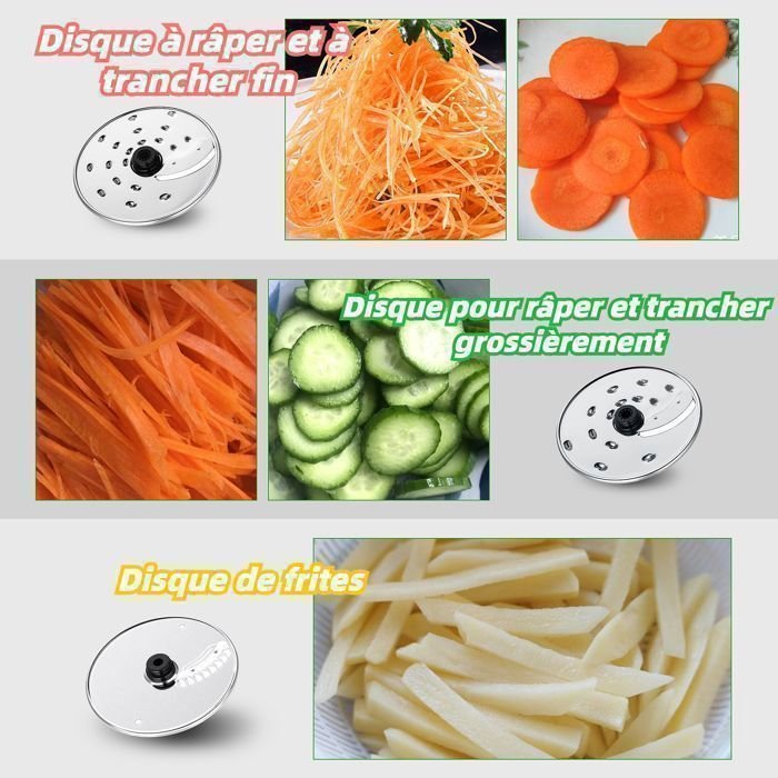 | También incluido | Cuchilla de corte de acero inoxidable, cuchilla para masa, tazón para mezclar, molinillo, batidor de huevos, empujador doble, espátula y disco mejorado para rebanar y triturar fino, disco para rebanar y triturar grueso, cortador de papas fritas |