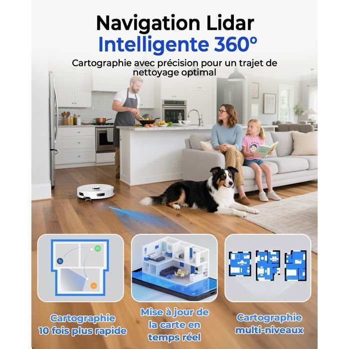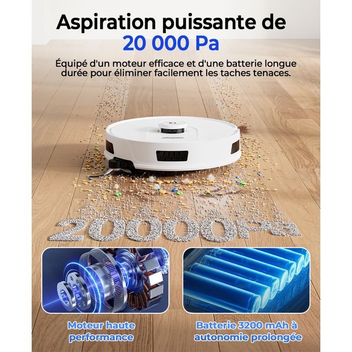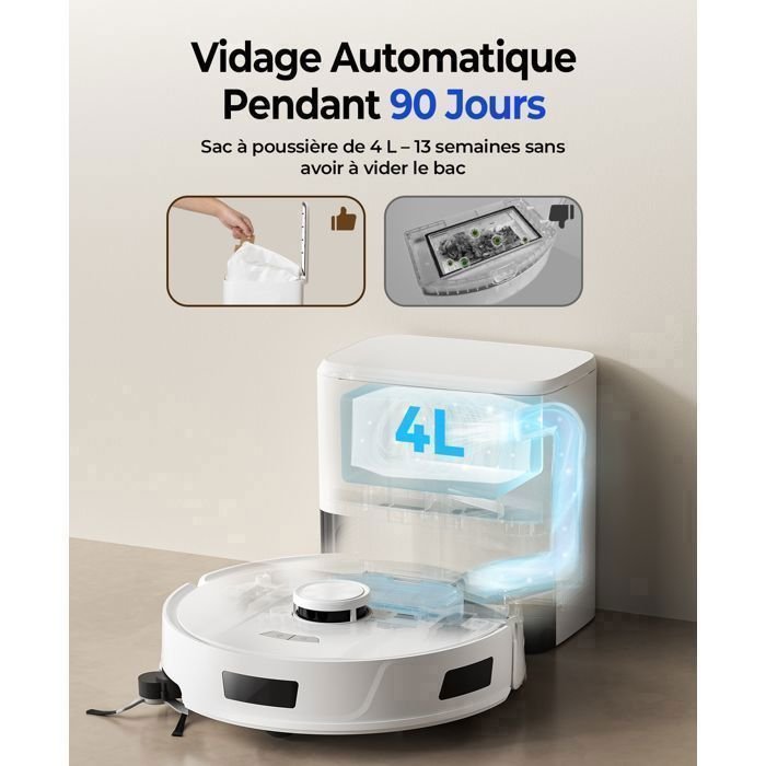 | Funciones especiales | Potente succión de 20.000 Pa: Elimina el pelo de mascotas y el polvo. Autonomía de 180 días: Vaciado automático en una bolsa de 4 L. Navegación LiDAR de 360°: Mapeo preciso de hasta 5 niveles. Limpieza 4 en 1: Barre, aspira, friega y vaciado automático. Autonomía de 200 minutos: Recarga automática. Control por app y voz: Alexa, Asistente de Google y planes de limpieza. |